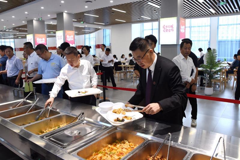 仪式后,殷杰、薛晋文、李民、冯程共同切分庆祝蛋糕。殷杰、薛晋文同教职工代表进入餐厅排队取餐,并与教职工代表共同就餐。