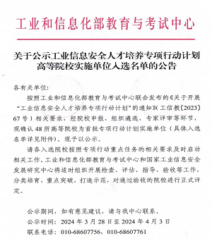 近日,国家工业和信息化部教育与考试中心发布《关于公示工业信息安全人才培养专项行动计划高等院校实施单位入选名单的公告》(3月29日),我校作为山西省唯一一所高等院校成功入选首批48所高校专项行动计划实施单位。