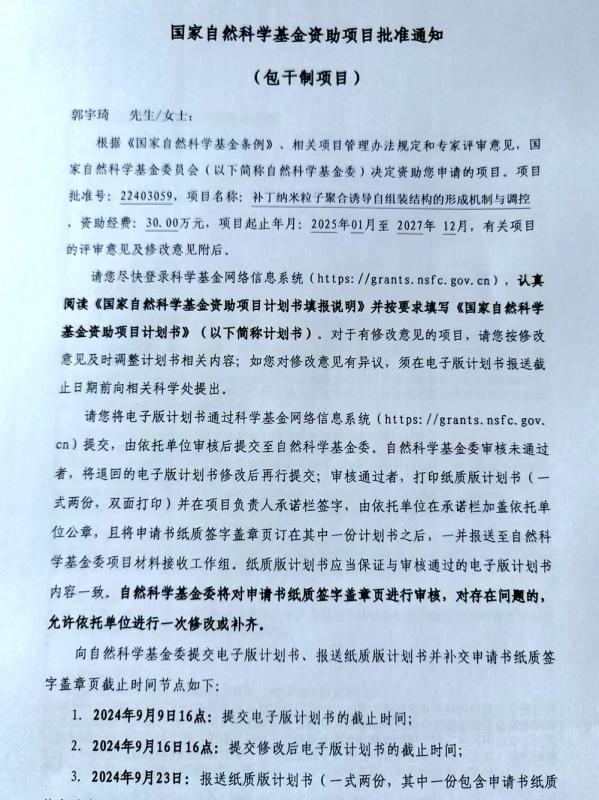 近日,国家自然科学基金委员会公布资助项目评审结果,我校化学与材料工程系郭宇琦副教授的项目《补丁纳米粒子聚合诱导自组装结构的形成机制与调控》[22403059]荣获国家自然科学基金青年项目资助立项。