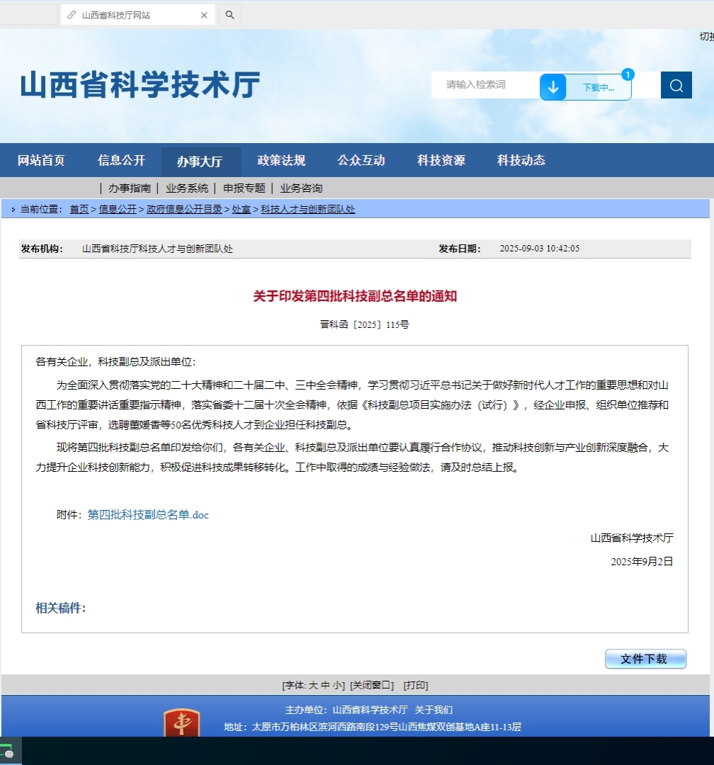 近日,山西省科学技术厅正式印发《关于印发第四批科技副总名单的通知》(晋科函〔2025〕115号),经企业申报、组织单位推荐及省科技厅严格评审,我校资源与机械工程系青年博士、副教授卢卫永同志成功入选第四批科技副总名单,为我校首个获批的科技副总。