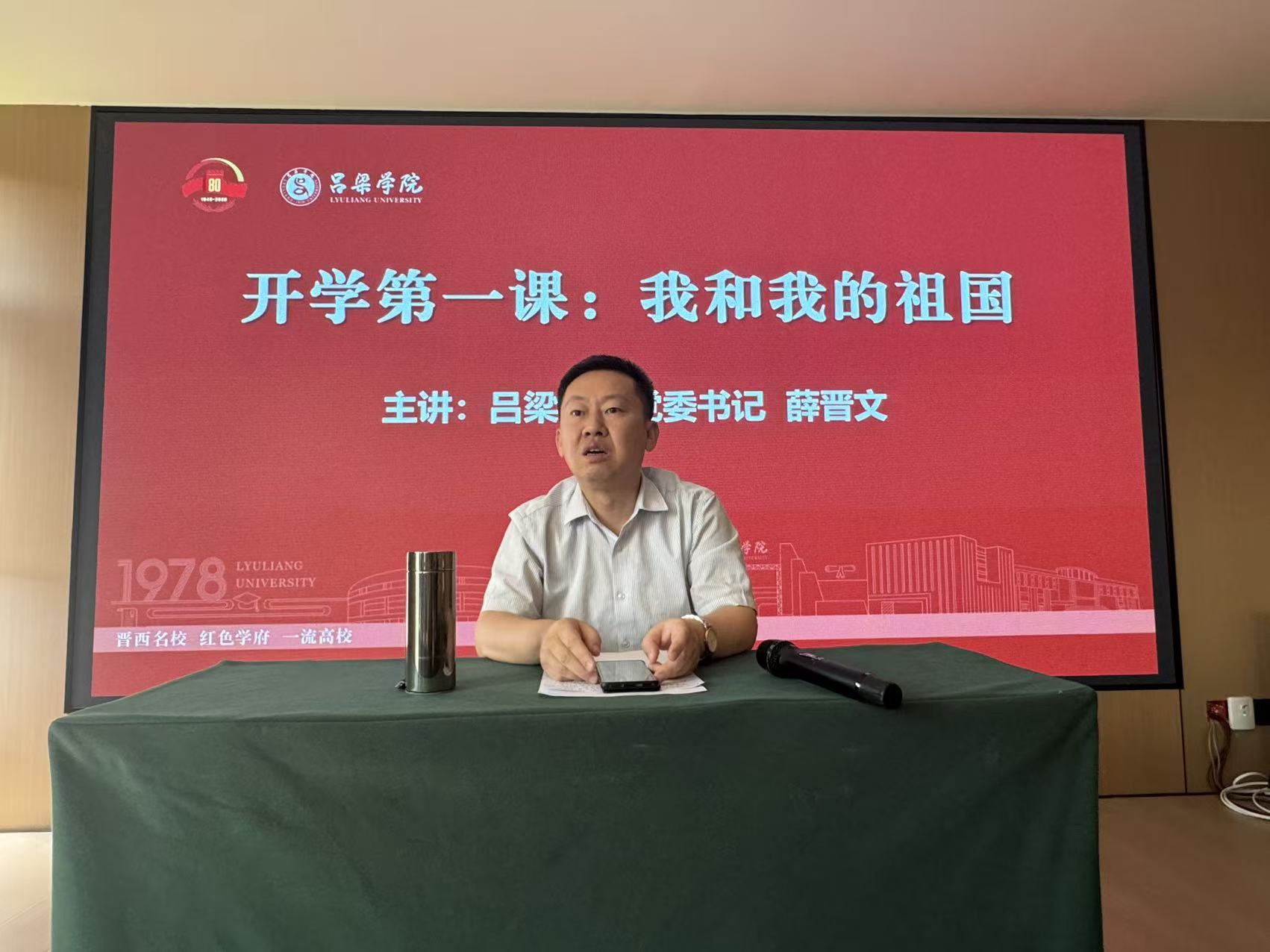 9月3日上午,校党委书记薛晋文带领党委办公室、宣传部、艺术系等单位有关人员以及吕梁学院晋绥剧社合唱团全体师生,认真聆听了习近平总书记发表的重要讲话,观看了纪念中国人民抗日战争暨世界反法西斯战争胜利80周年阅兵式。并为与会人员讲授题为《我和我的祖国》的开学第一课。
