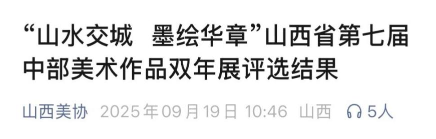2025年9月19日,我校教师梁宇、王瑞兵、吕宇朝、杨岩、张彦伟及美术学专业2202班学生薛宇宇、李慧琳、郭玉娟、牛乐的作品入选由山西省美术家协会主办的《“山水交城 墨绘华章”第七届山西中部美术作品双年展》。本次展览4名学生入展,均为梁宇老师《中国画创作》课程的教学成果,这些作品围绕山西中部地区历史文化传承、新时代新气象、人民美好生活及自然风光、人文景观等主题进行精心创作。