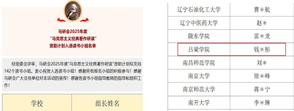 10月19日,中国高等教育学会马克思主义研究分会公布2025年度“马克思主义经典著作研读”资助计划名单,由吕梁精神研究中心薛金莲、周晓荣老师指导的“吕梁薪火”研读小组成功入选,成为吕梁学院首个获得此项资助的读书小组。本年度全国共有142个小组获此殊荣。
