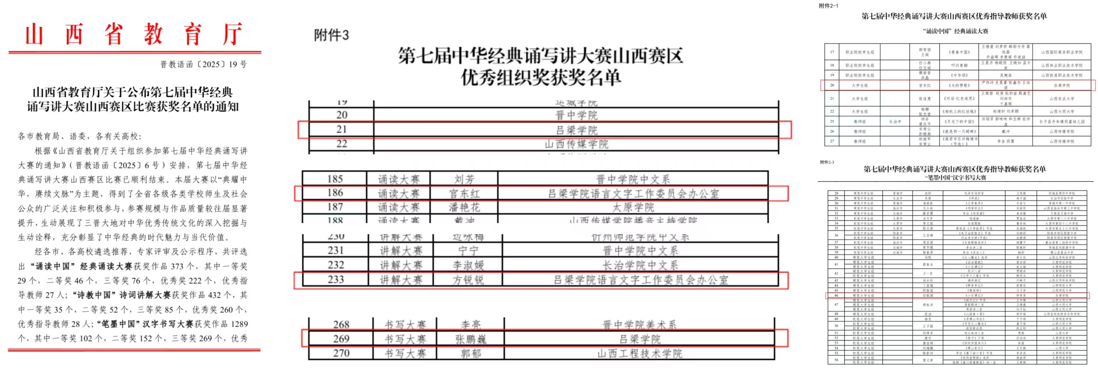 11月5日,第七届全国中华经典诵写讲大赛山西赛区比赛结果正式揭晓。我校深入贯彻落实中华优秀传统文化传承发展要求,扎实推进文化育人工作,在诵读、讲解、书写等赛项中取得优异成绩,荣获多项表彰,充分彰显了我校在弘扬中华优秀传统文化方面取得的显著成效。