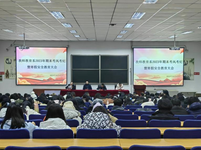 为进一步加强诚信教育,严肃考风考纪,强化安全意识和自我防范意识,12月27日,教师教育系在1C-201召开2023年期末考风考纪暨寒假安全教育大会。系领导班子、分团委书记、专职辅导员、班主任以及学生代表等共计400余人参会。系党总支副书记牛华亮主持会议。