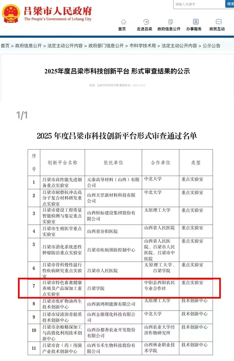 近日,吕梁市科学技术局公布《关于2025年度吕梁市市科技创新平台建设拟立项名单的公示》项目名单,由我校申报的创新平台项目“吕梁市特色畜禽健康养殖及产品深加工重点实验室”成功获批。