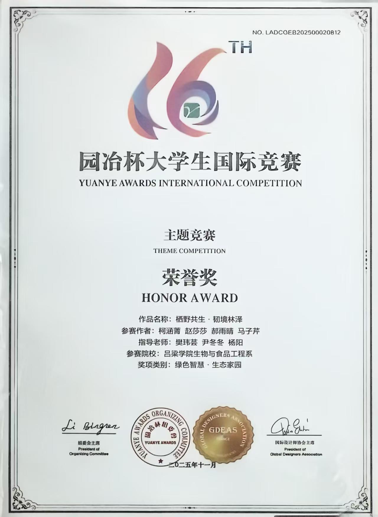 园林教研室樊玮芸、尹冬冬、杨阳老师指导的园林专业柯涵菁、赵莎莎、郝雨晴、马子芹学生作品“栖野共生 韧境林泽”获得第十六届园冶杯大学生国际竞赛风景园林(主题竞赛)荣誉奖、生物与食品工程系获“先进教育集体”荣誉称号。