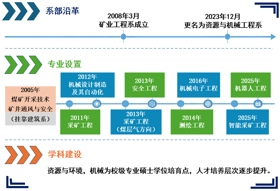 系部成立以来,资源与机械工程系从最初两个专科专业起步,历经十八年建设,现已发展为八个“智能+”融合型本科专业,涵盖采矿工程、采矿工程(煤层气方向)、智能采矿工程、机械设计制造及其自动化、机械电子工程、机器人工程、安全工程、测绘工程。采矿工程入选省级一流本科专业建设点,采矿工程(煤层气方向)获批省级优势特色专业,机械设计制造及其自动化纳入西安交通大学拔尖人才联合培养计划。资源与环境、机械两大学科列为校级硕士专业学位培育点。截至目前,系部累计开设教学班254个,培养毕业生6859人,现有在校生2229人。