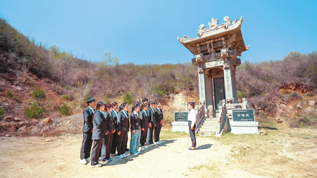 师生们自发停下脚步,整理好衣襟,在纪念亭前整齐列队,齐声合唱当地流传已久的民谣:“吃水不忘挖井人,恩人就是毛泽东;紧跟红军闹革命,全国奋起打日本。”歌声穿透山间,回荡在西庄村的上空。